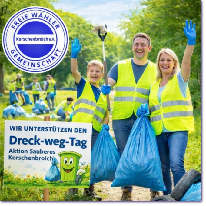 Unter dem Motto „Aktion Sauberes Korschenbroich“ findet wieder der traditionelle Dreck-weg-Tag statt. Ob Jung oder Alt, Vereine oder Einzelpersonen: Jede helfende Hand zählt, um unsere Parks, Waldränder und Straßen von achtlos weggeworfenem Unrat zu befreien.